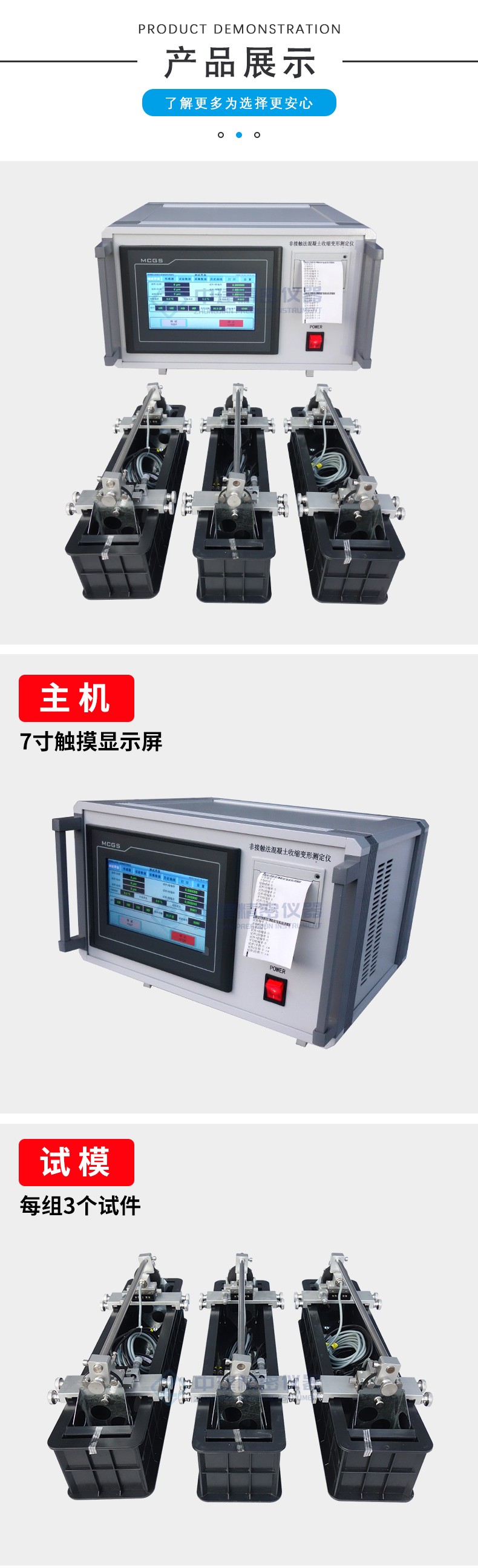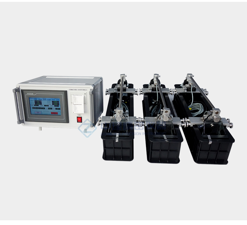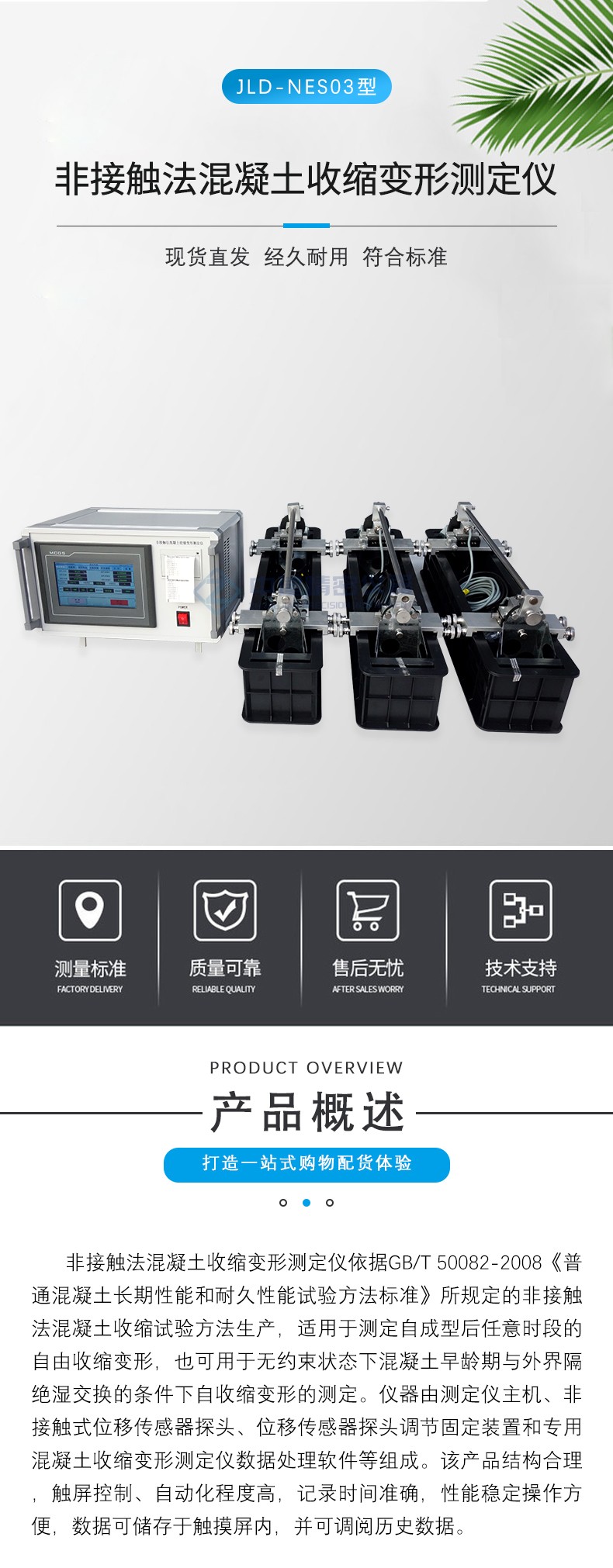 非接觸法混凝土收縮變形測定儀依據GB/T 50082-2008《普通混凝土長期性能和耐久性能試驗方法標準》所規定的非接觸法混凝土收縮試驗方法生產,適用于測定自成型后任意時段的自由收縮變形,也可用于無約束狀態下混凝土早齡期與外界隔絕濕交換的條件下自收縮變形的測定。儀器由測定儀主機、非接觸式位移傳感器探頭、位移傳感器探頭調節固定裝置和專用混凝土收縮變形測定儀數據處理軟件等組成。該產品結構合理,觸屏控制、自動化程度高,記錄時間準確,性能穩定操作方便,數據可儲存于觸摸屏內,并可調閱歷史數據。