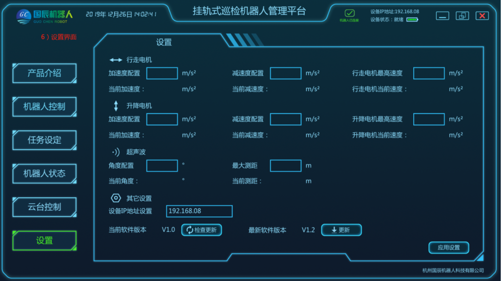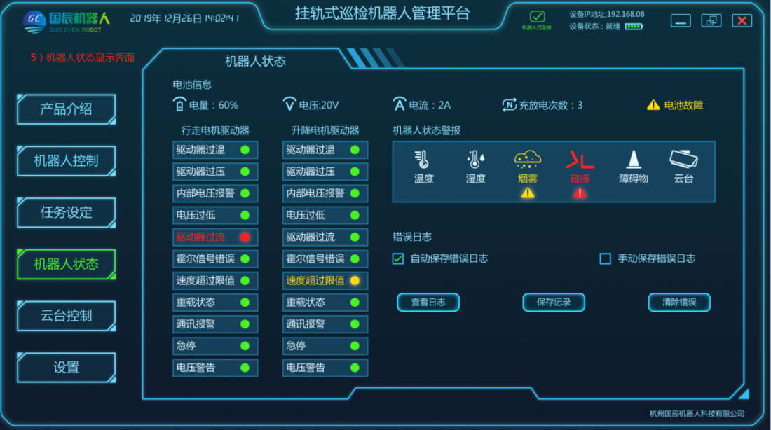 項目主要由移動機器人本體、軌道系統(tǒng)、采集設備、定位系統(tǒng)、供電和通信系統(tǒng)、后臺系統(tǒng)等結構組成。在巡檢工作過程中,由用戶設定任務點,加裝采集設備,移動機器人根據(jù)控制指令在軌道上運動,將采集設備運送到指定位置采集數(shù)據(jù),且滿足所需要的負載量,速度;在機器人行駛過程中可實現(xiàn)自主爬坡、采集設備可根據(jù)監(jiān)測物體高度進行升降調整等功能;配套的調試軟件支持手動、控制移動平臺運動;具有較強的適用性及拓展性,可自定義模塊搭配,自主設定任務點,自動巡檢、定點采集、自動充電等功能。